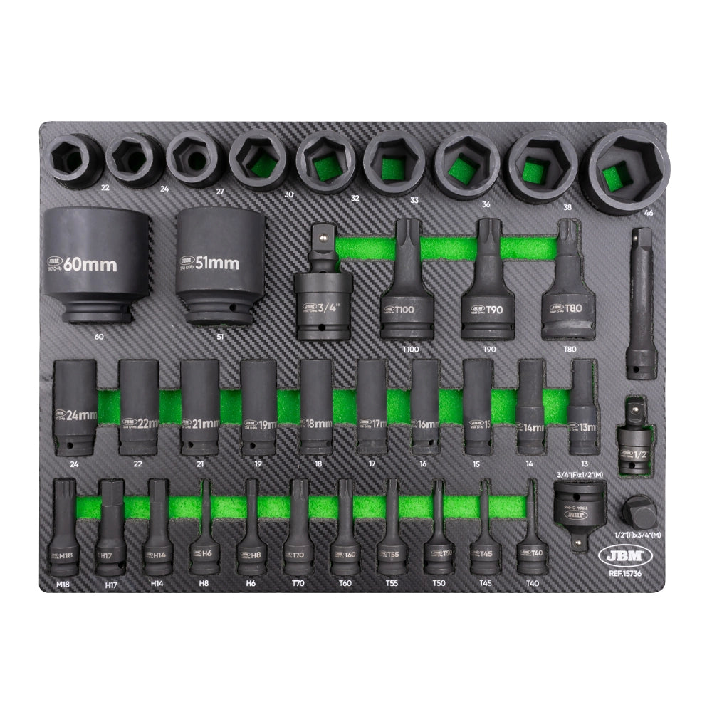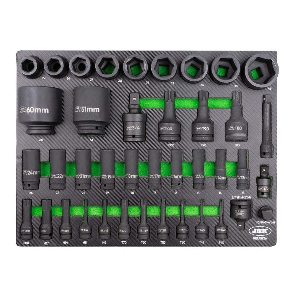 9 Vasos de impacto hexagonales de 3/4" : 22, 24, 27, 30, 32, 33, 36, 38, 46mm