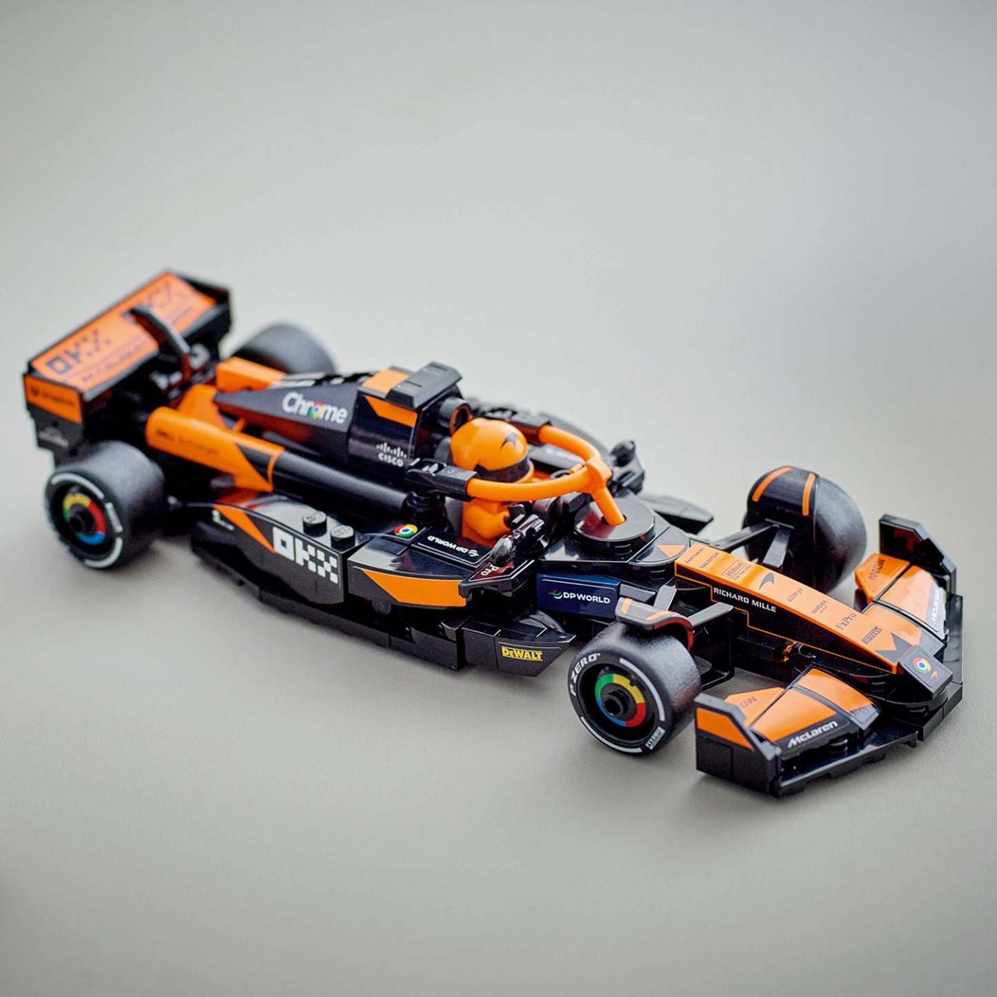 The F1 model car features a cockpit that opens by lifting the halo bar, a rear wing, wishbone suspension, sponsor stickers and wider rear tyres imprinted with “Pirelli”. The toy vehicle also comes with a driver minifigure wearing a McLaren outfit and a winged helmet to place inside the cockpit for racing action.