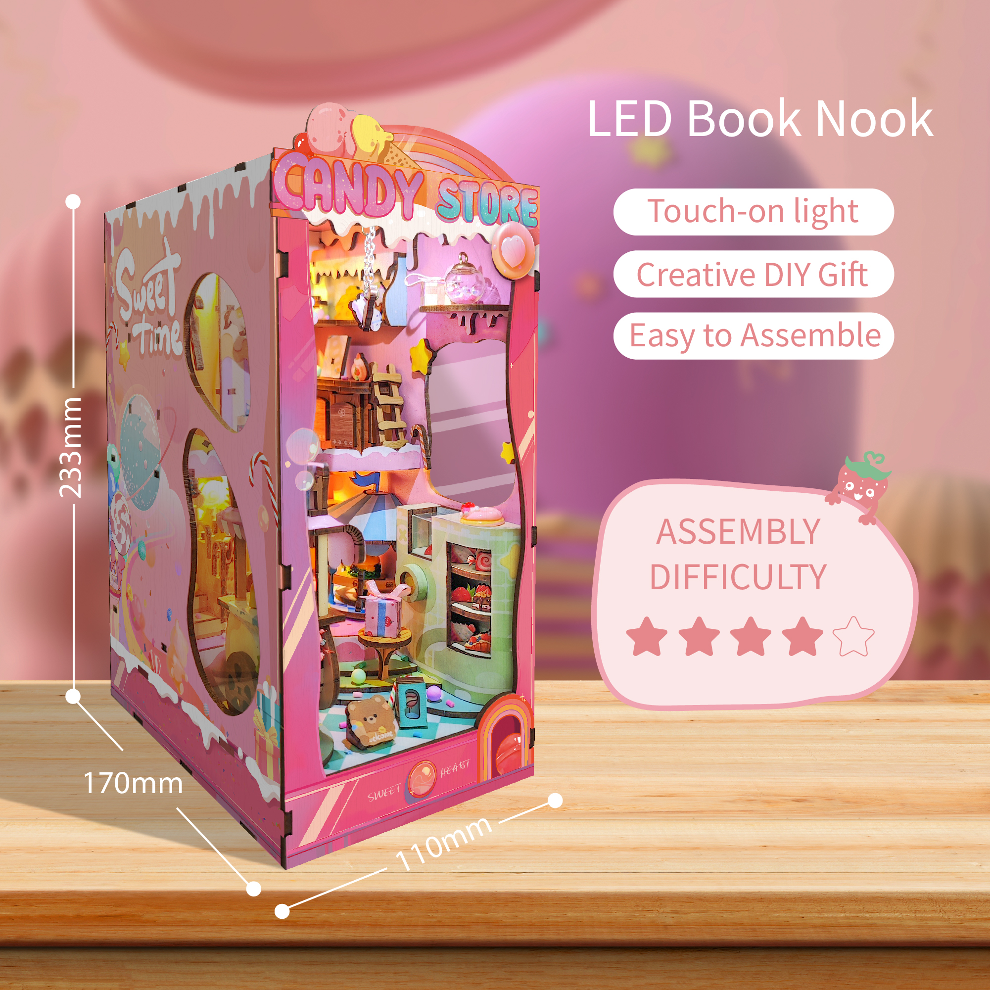 Step into a whimsical world of color and creativity with the Candy Store DIY Book Nook Kit — a miniature candy paradise. Crafted from high-quality, eco-friendly materials, this delightful kit combines decorative elegance with educational value, offering a satisfying and immersive experience for hobbyists of all skill levels. Bursting with vibrant details and layered surprises, it comes with clear instructions for stress-free assembly.
