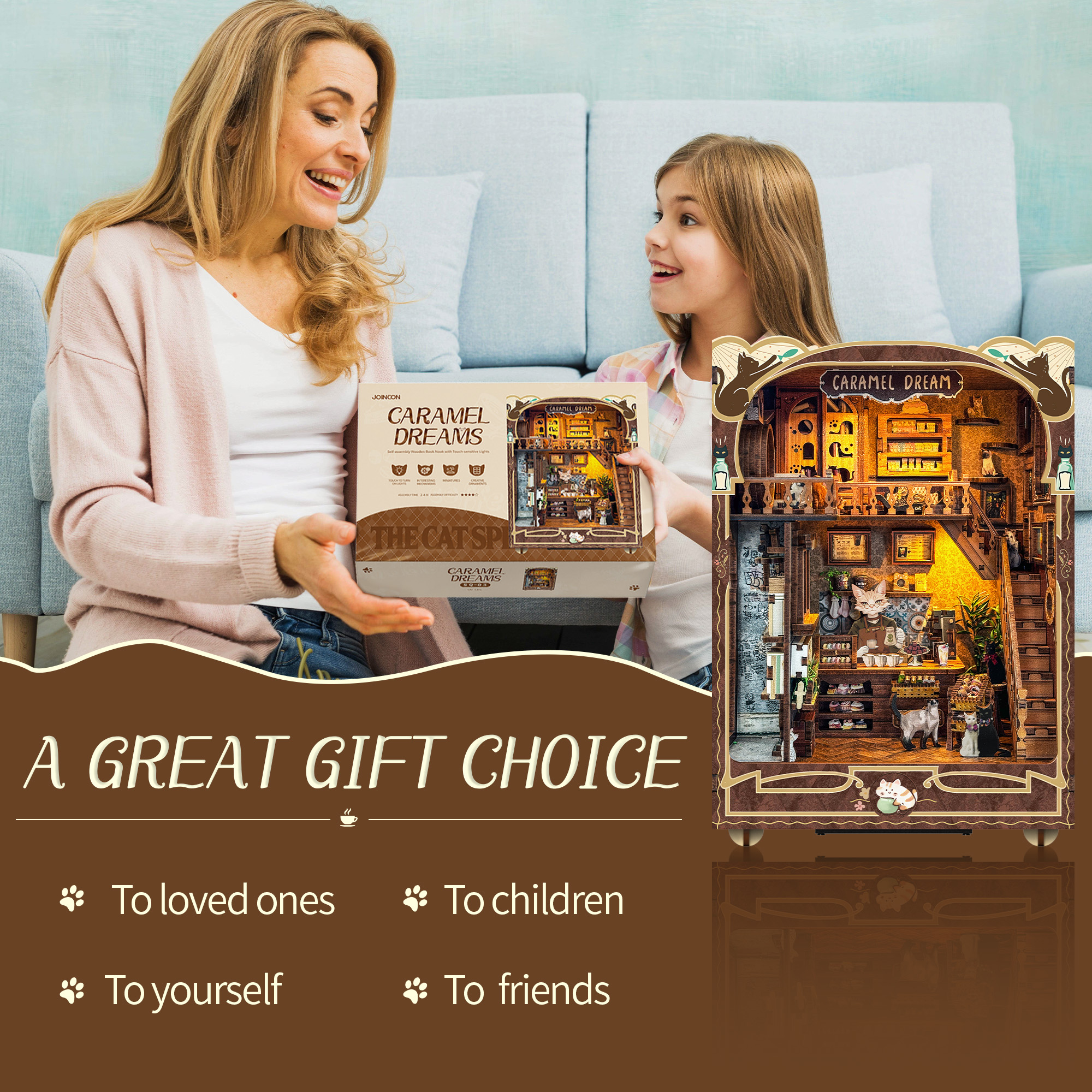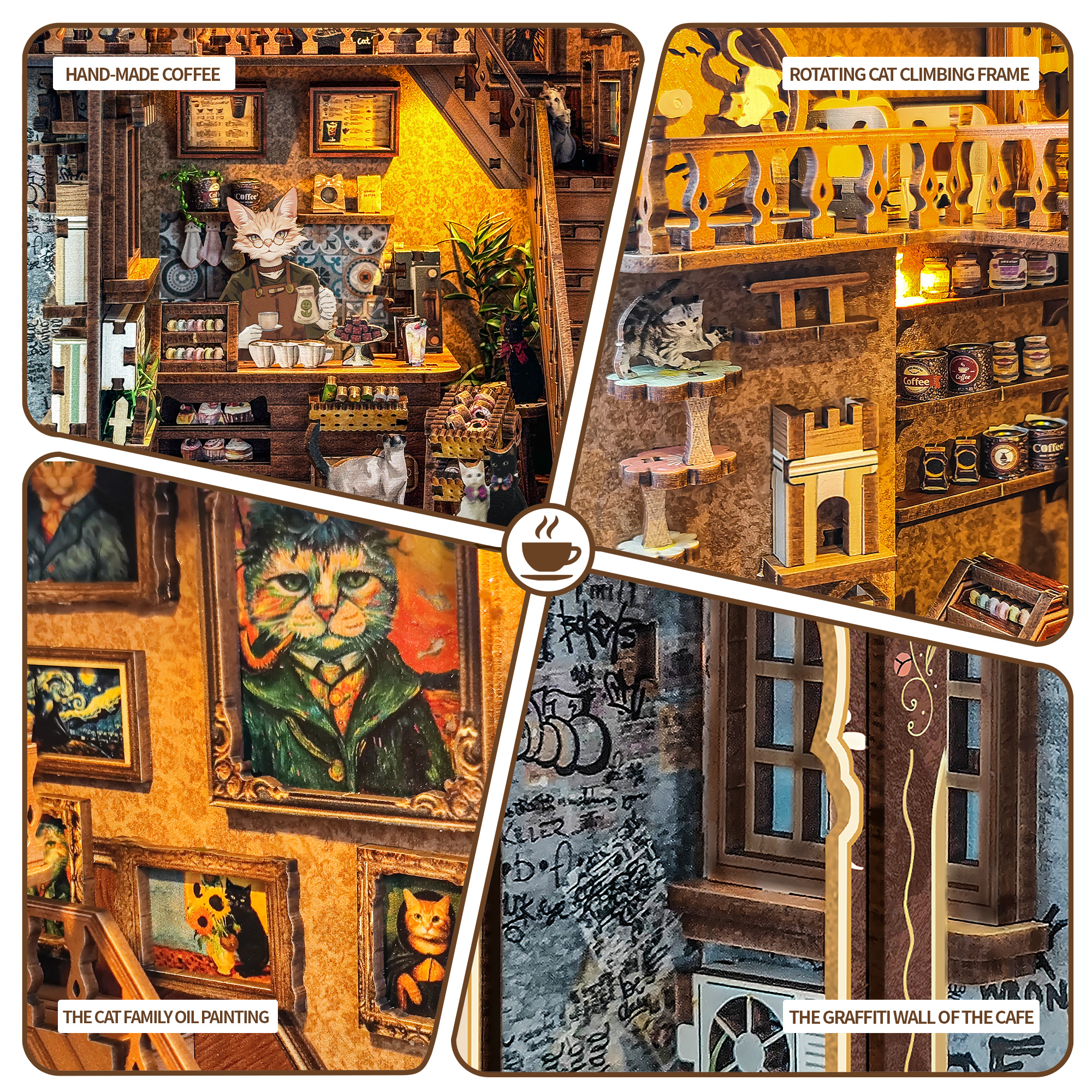Step into Caramel Dreams DIY Cat Café — a cozy miniature world where cats brew coffee, lounge in rotating towers, and bring charm to every corner. With touch-activated glowing lights, whimsical details like a graffiti wall and tiny coffee cups, and high-quality pieces for a satisfying build, this book nook is a purr-fect project for cat lovers, bookworms, and crafters alike. It’s a joyful escape into a world where coffee and feline mischief collide, guaranteed to bring a smile every time you see it.