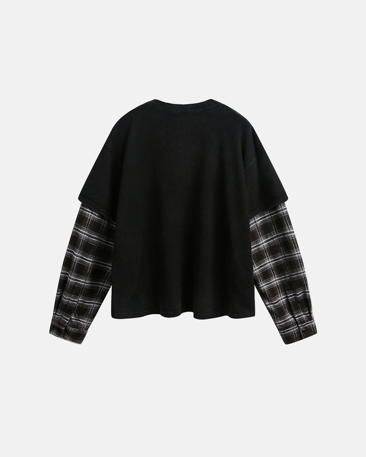 This tshirt crafted with a unique distressed design, plaid sleeves, and a bold cropped silhouette, ripped detail. this shirt is perfect for those who want a blend of vintage and modern street style.