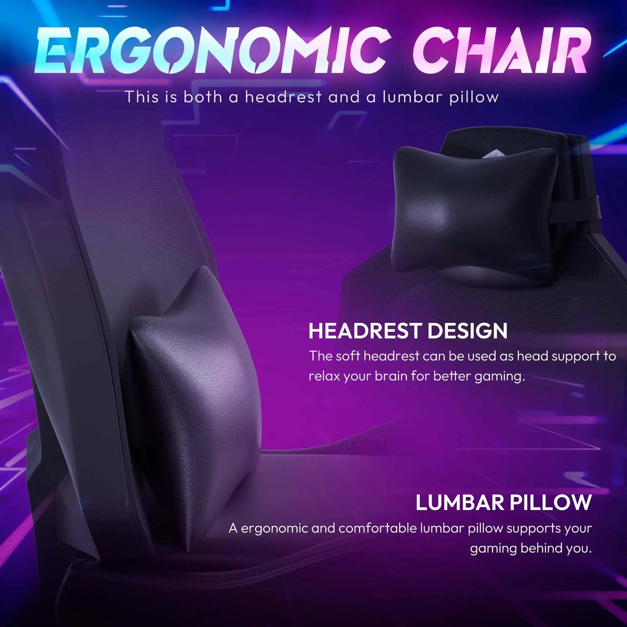 - Ergonomic gaming chair for adults: The chair features a new curve that adapts perfectly to the human waist, and the package includes additional lumbar cushions that provide extra support. This PC gaming chair provides exceptional ergonomic support throughout, whether you have a longer gaming session or working at the computer.