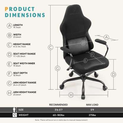 - Better Comfort for You: This gaming chair has padded armrests that provide effective support for your elbows while still ensuring comfort. You can rock your chair at work or play to relieve tension and exhaustion. In addition the height of the cushion can be adjusted in the range of 17.2 inches and 20.3 inches, so that your legs naturally step on the ground vertically to maintain the best sitting posture.