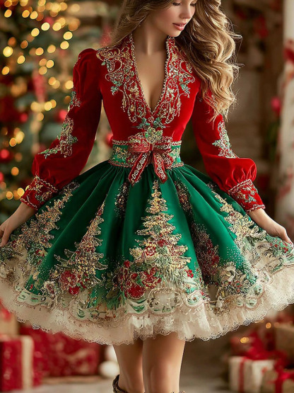 Elegant V-neck Dress With Retro Christmas Tree Contrast Sequin Pattern