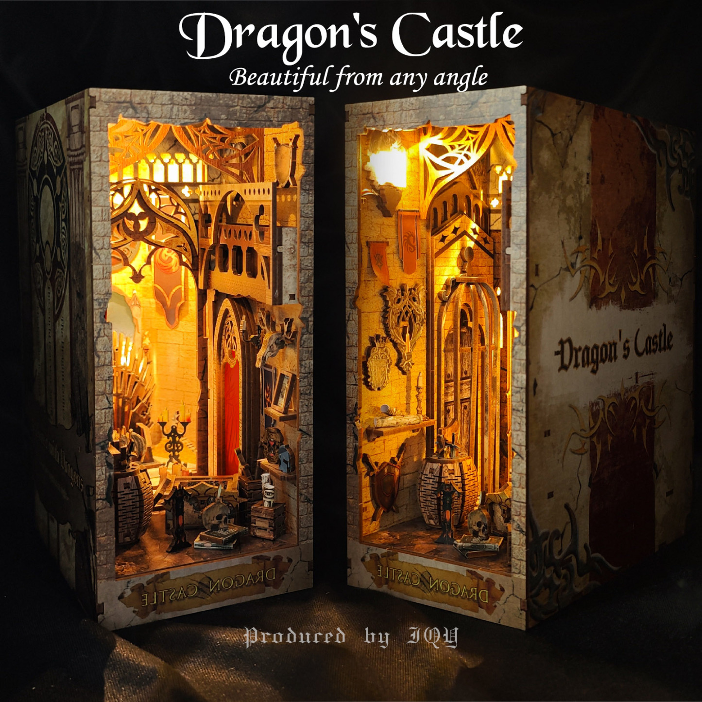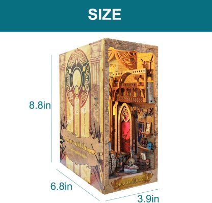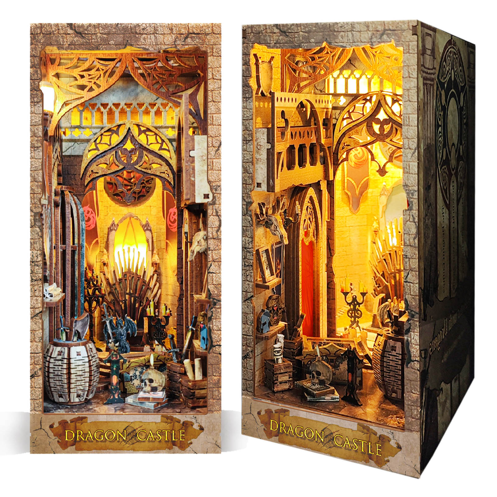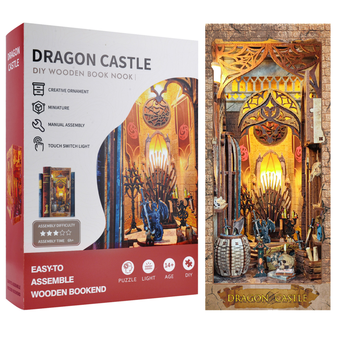 Embark on a magical building journey with the Dragon Castle DIY Book Nook Kit, a fantasy-inspired 3D wooden puzzle that transforms into a breathtaking miniature scene right on your bookshelf. Crafted from premium-quality wood, this enchanting kit features intricate castle details and a mighty dragon, brought to life with a touch-activated LED light that casts a warm, cozy glow. Both decorative and functional, it doubles as a unique bookend while adding a whimsical touch of fantasy to your reading nook.