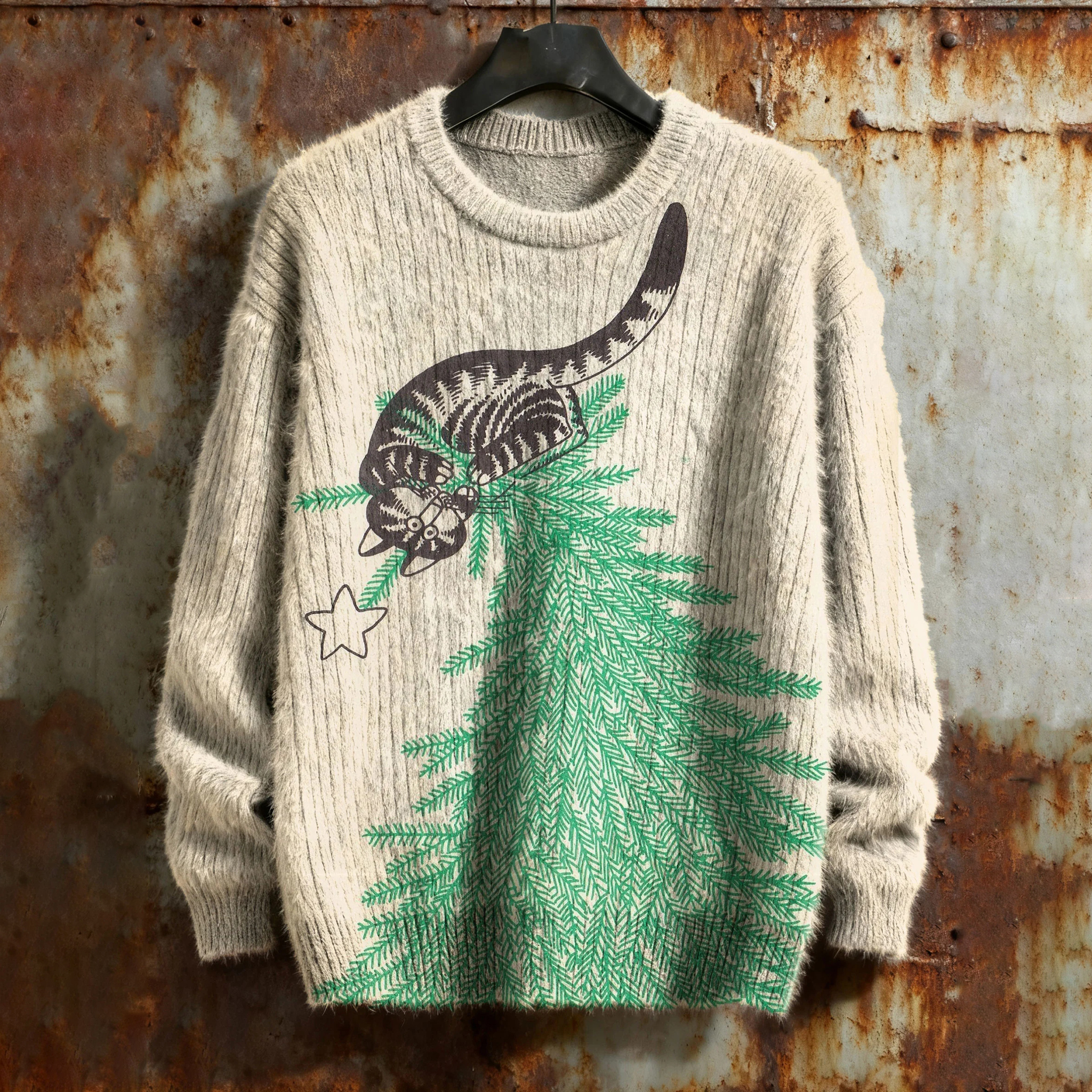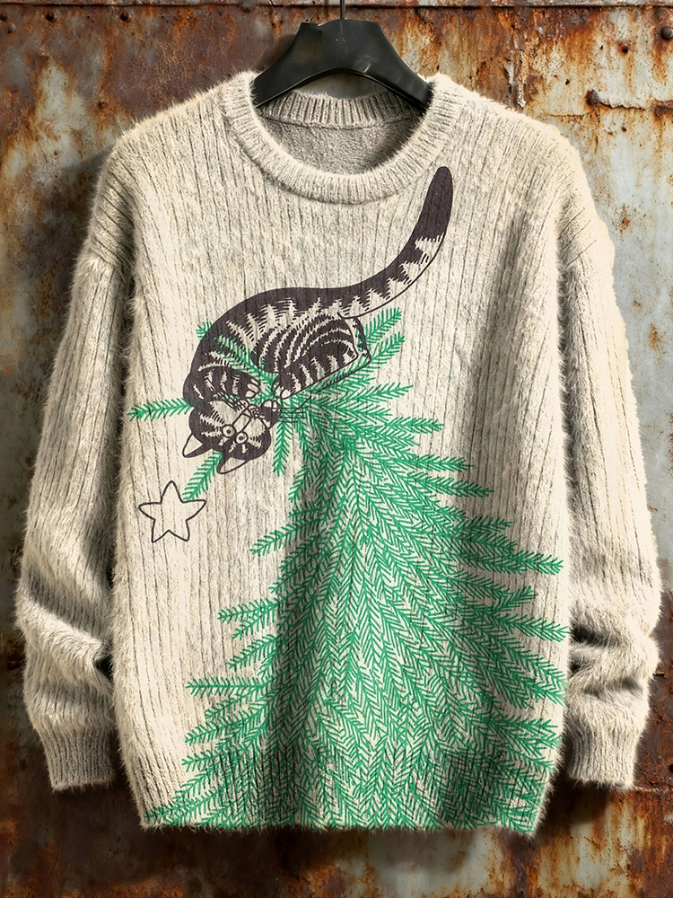Men's Christmas Tree Cat Print Cozy Knitted Pullover Sweater