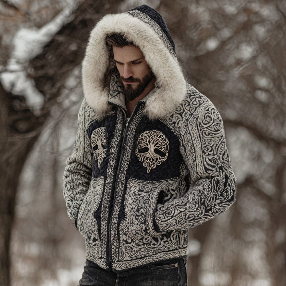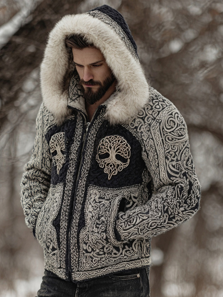 Men's Viking Tree Of Life Inspired Fur Trim Hooded Cardigan