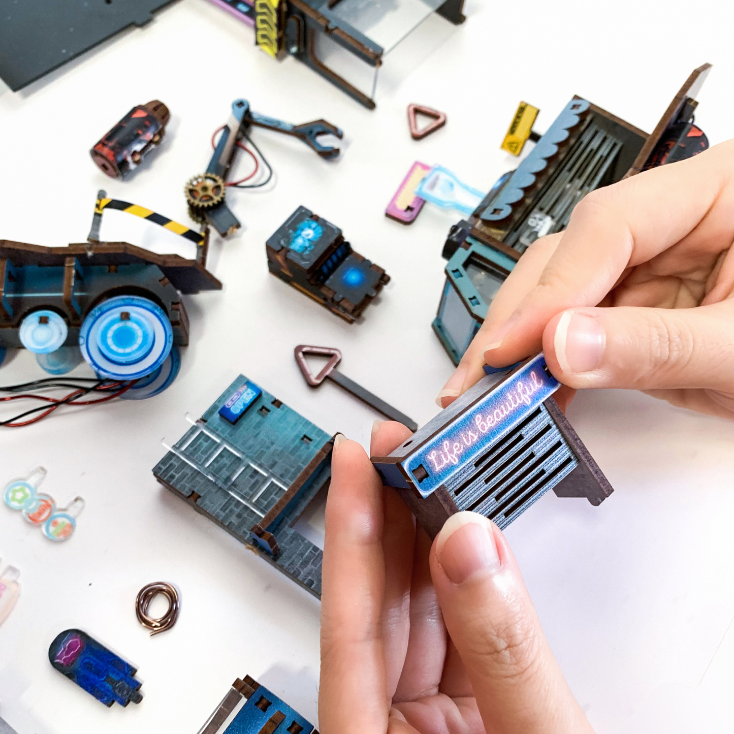 You would have thought that you had entered a cyberpunk city that was flooded with neon! This DIY kit is full of cyberpunk details: glowing nightclub signs, a futuristic bar counter, even a small shop with a guitar sign glowing in neon hanging above it, and wires and lights running throughout the buildings give a slightly chaotic feel.