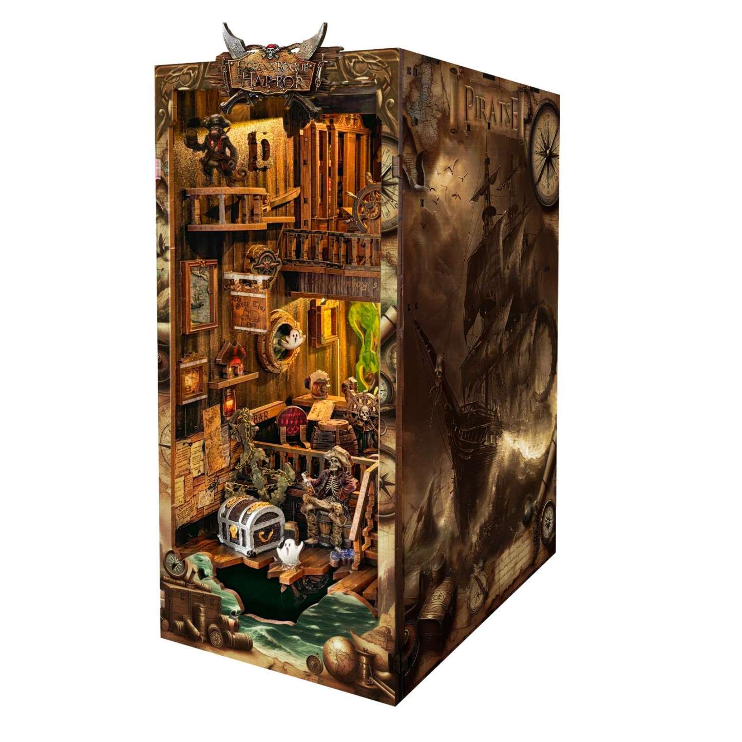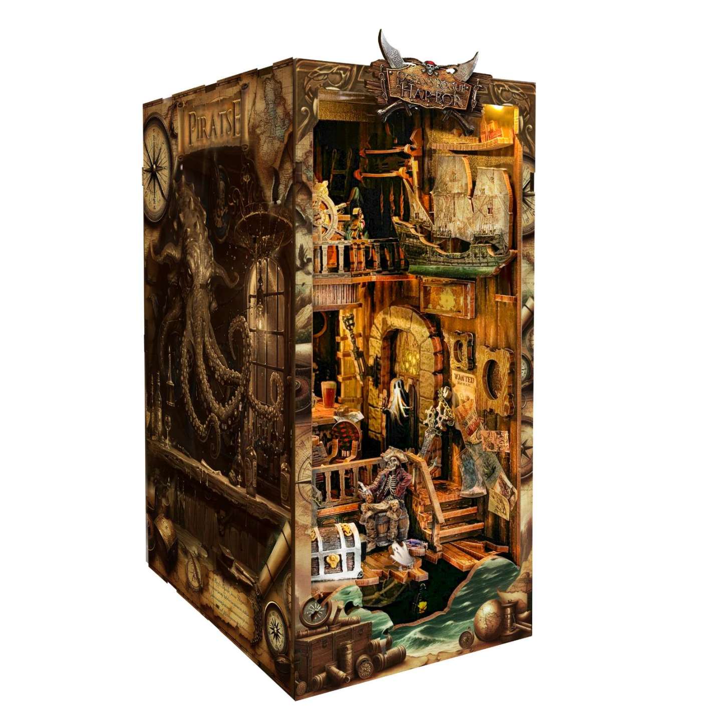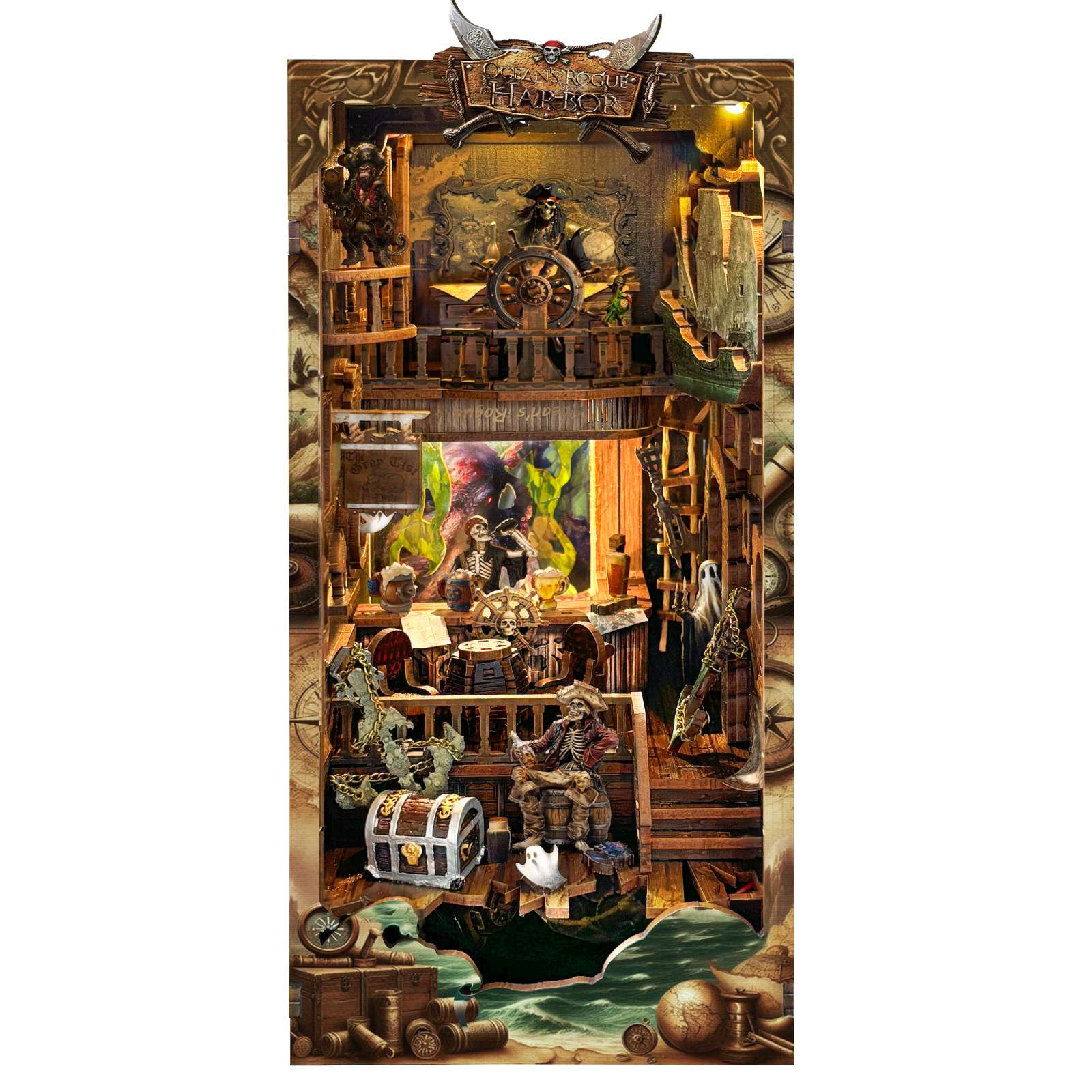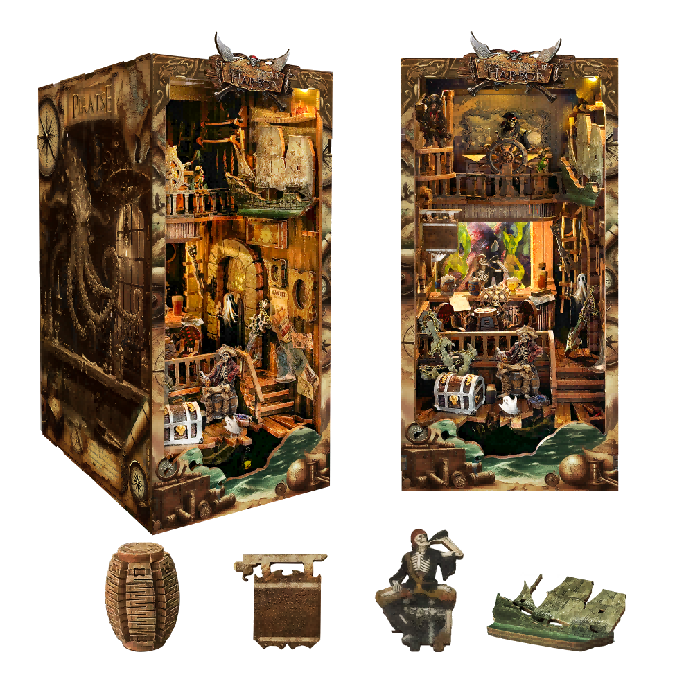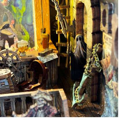 Set sail on a spine-tingling adventure with the New World Ghost Ship DIY Book Nook Kit, a haunting diorama that transforms your bookshelf into a ghostly pirate harbor. Touch-activated LED lights cast an eerie glow over the shipwreck, cursed treasure, and skeletal crew. Crafted from high-quality wood with intricate details—like a ghost captain and lurking kraken—this compact 3D scene is both a fun project and a striking display piece for fans of mystery, fantasy, and the supernatural.