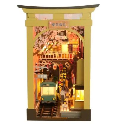 Tokyo Sakura Holiday is a book nook kit that draws inspiration from springtime in Kyoto, and is rich in Japanese cultural detailed such as Torii Gate frame design and Sakura blossoms in springtime which is a famous tourist attraction in Japan, lantern hang along the alleyway, green and cream-colored train on the tracks with railway crossing signal at side fully reflects Japanese street scene all adds to traditional culture charm of Japan.