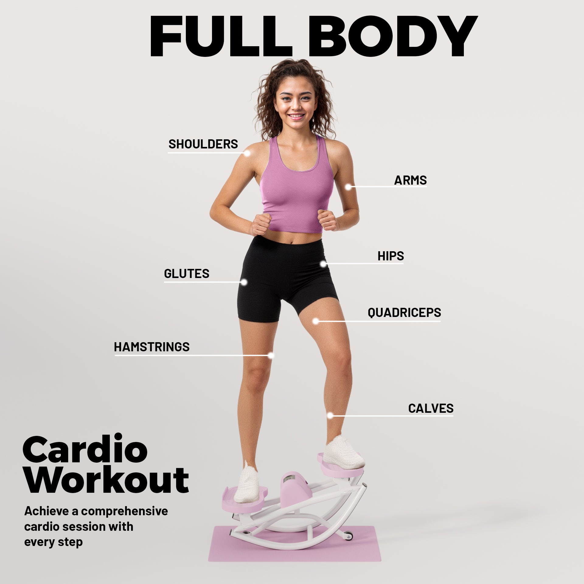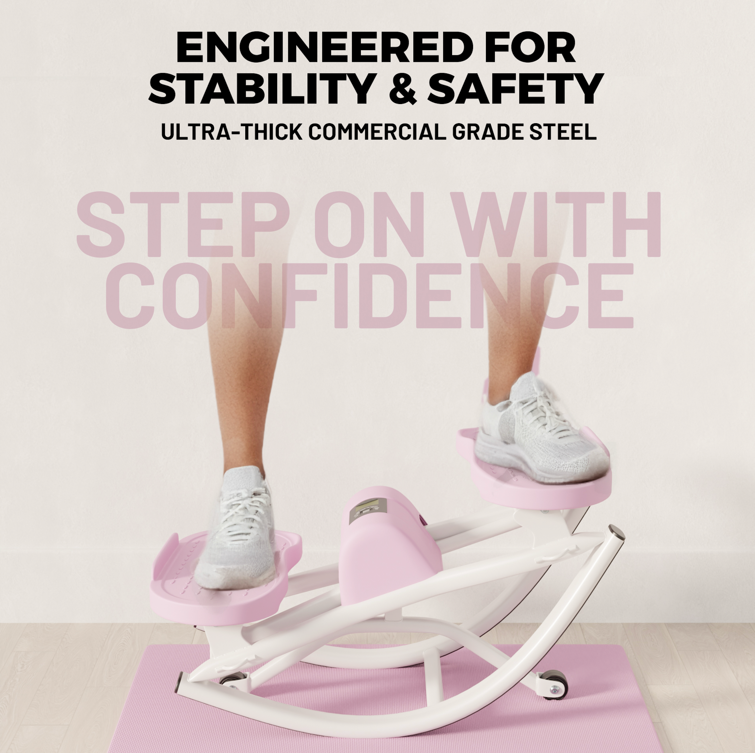 - Lateral rocking motion – specifically targets hips, thighs & buttocks regular steppers miss